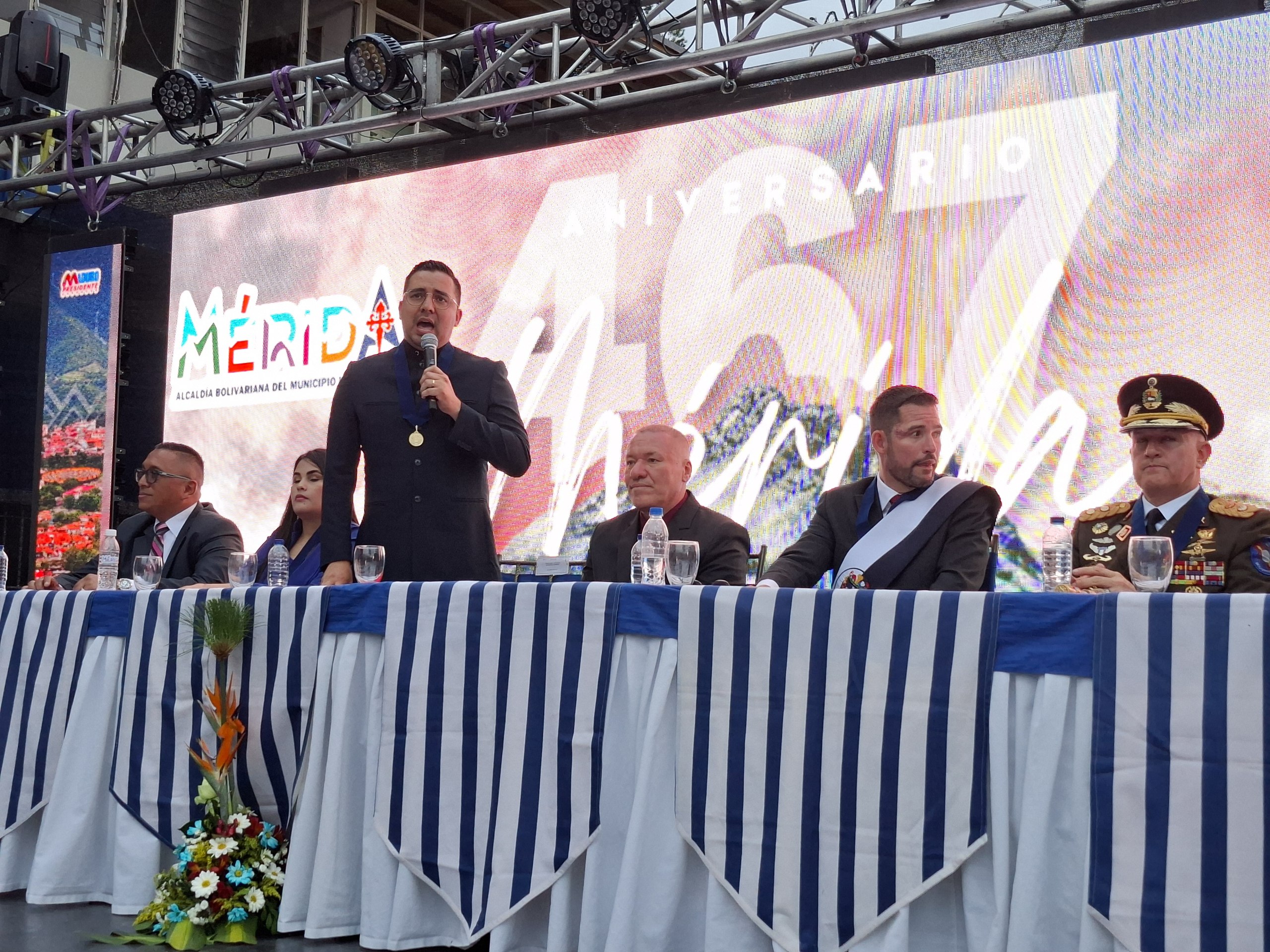 En el acto fueron condecorados personalidades con la Orden Ciudad de Mérida; el condecorado Juan Carlos Márquez, del partido Podemos, culminó con un fuerte llamado a los merideños a seguir trabajando en pro del desarrollo comunal y la seguridad de Mérida, reafirmando que el trabajo conjunto es fundamental para el progreso del pueblo merideño. /Prensa Gobernación de Mérida / Carlos Pacheco